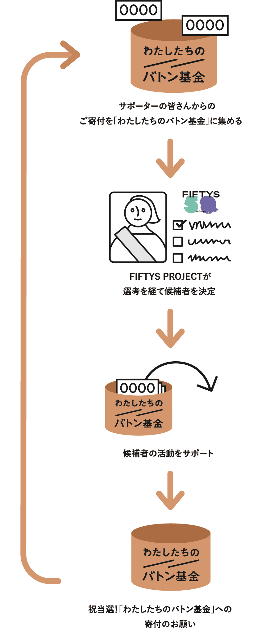 この基金では、そのための元手となる資金を募っています。いいただいたご寄付は、FIFTYS PROJECTによる選考を経た候補者のサポートのために届けられます。